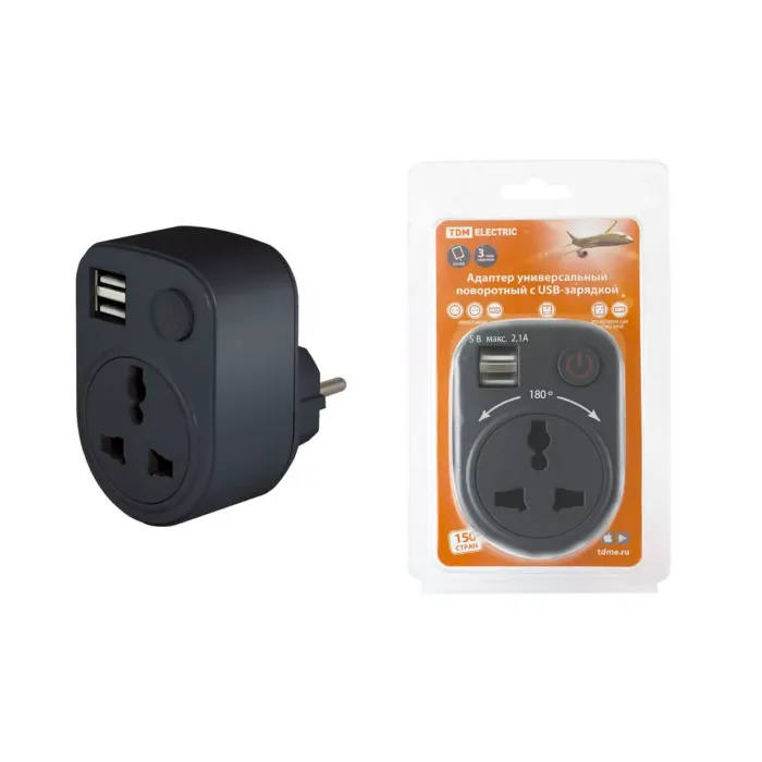 Адаптер универсальный поворотный с/з 250В 16А + 2USB 2.1A черный TDM