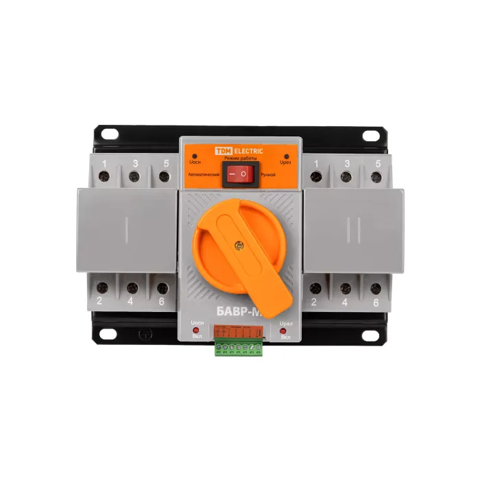 Назначение: Обеспечение резервным питанием нагрузки, подключенной к системе электроснабжения, имеющей основной и резервный вводы номинальным напряжением до 380 В Контроль питания фазы для БАВР-М 40-63 А – по первой фазе, для БАВР-М 80-100 А – по трём фазам Переключение устройства на резервную линию при пропадании основного питания происходит автоматически