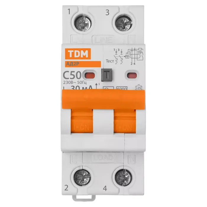 Диф.автомат АД2P 2Р С50 30мА 6кА тип АС TDM