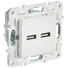 Механизм Systeme Electric (ранее Schneider Electric) серии AtlasDesign в цвете белый розетки для зарядки с двумя разъёмами USB с выходными напряжением 5 В постоянного тока и выходами с номинальным током по 2,1 А.