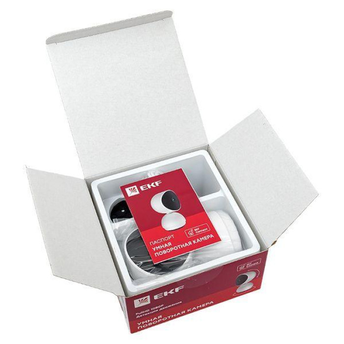 Умная поворотная камера EKF Connect будет отлично выглядеть в любом интерьере. Она позволяет легко организовать видеонаблюдение за домом или квартирой, а также присматривать за детьми или питомцами. Можно в любой момент посмотреть картинку с камеры в приложении EKF Connect Home для Android и iOS. Камера поворачивается по вертикали и горизонтали, также есть режим автоматического слежения за движущимся объектом. Видео записывается на карту памяти или передаётся по открытому протоколу ONVIF. Также есть функция определения движения с отправкой уведомления и фотографии в приложение, ночной режим с ИК-подсветкой до 10 метров, микрофон и динамик для двухсторонней аудиосвязи. Камеру можно поставить на любую горизонтальную поверхность или закрепить шурупами из комплекта на стене или потолке. Преимущества: Разрешение FullHD 1080p, матрица 2 МП. Функция определения движения с отправкой уведомления и фотографии в приложение. Ночной режим с ИК-подсветкой до 10 метров. Микрофон и динамик для двухсторонней аудиосвязи. Поддержка прот