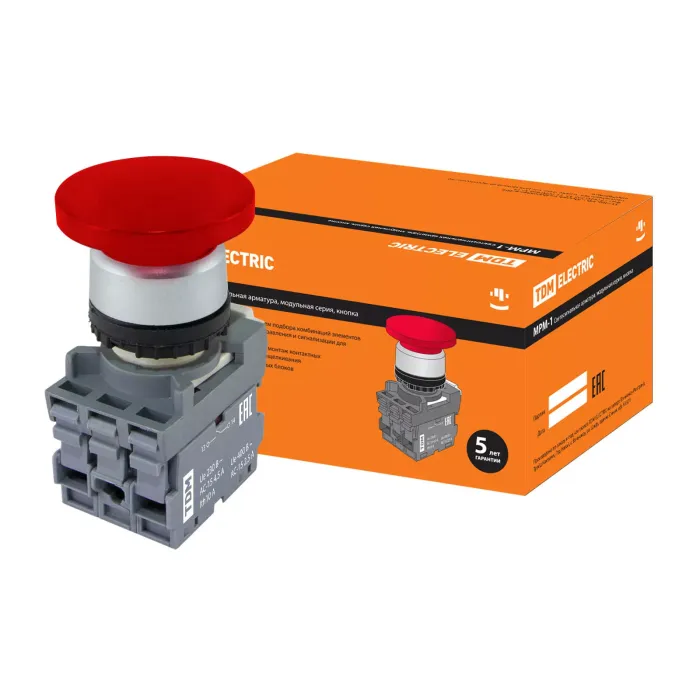 Назначение: Светосигнальная арматура модульной серии обладает лучшими эксплуатационными характеристиками и повышенной надежностью.Для коммутации электрических цепей управления напряжением до 690 В переменного тока частотой 50/60 Гц и напряжением до 440 В постоянного тока.Применение: В промышленности, на объектах инфраструктуры, в строительстве.Светосигнальная арматура модульной серии отличается простотой монтажа контактных блоков посредством защелкивания без использования инструментов.Конструкция: Гайка.Монтажная колодка:выпускаются монтажные колодки для установки трех или пяти блоков в один ряд;на монтажных колодках на три блока предусмотрена возможность установки дополнительных блоков на втором уровне.Светодиодный/ламповый блок. В кнопках, сигнальных лампах и переключателях с подсветкой ламповый блок устанавливается в центральном положении на монтажной колодке.Корпус.Кнопка, линза и ручка:выпускаются в нескольких цветовых исполнениях;с подсветкой или без подсветки.Контактный блок однополюсный с замыкающим или размыкающим контактом. Кнопка грибовидная МРМ1-10R в сборе d40мм 1з+1р красная TDM