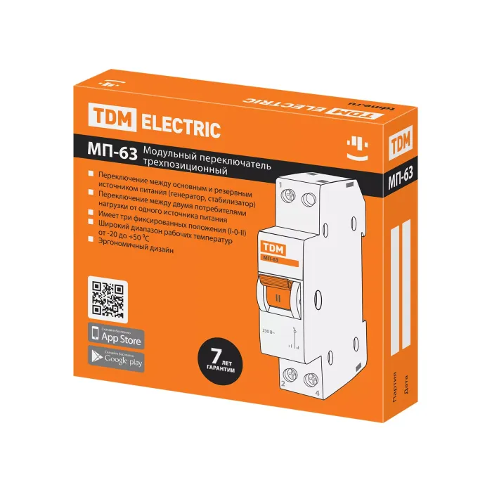 Назначение: Проведение тока в нормальном режиме.Оперативное включение и выключение электрических цепейПереключение электрических цепей.Применение: Вводно-распределительные устройства для жилых и общественных зданий.Преимущества: Компактные размеры шириной в один модуль 18 мм.Эргономичная рукоятка управления, исключающая соскальзывание пальцев.Подвод питающей линии и нагрузки может производиться как через верхние, так и через нижние контакты МП-63, без нарушения работоспособности.Материалы: Корпус и детали аппарата выполнены из пластика, не поддерживающего горение.Упаковка: МП-63 1Р по 12 шт.МП-63 2Р по 6 шт.МП-63 3Р по 4 шт.МП-63 4Р по 3 шт.Руководство по эксплуатации - 1 шт. на групповую упаковку Паспорт - 1 шт. на групповую упаковку