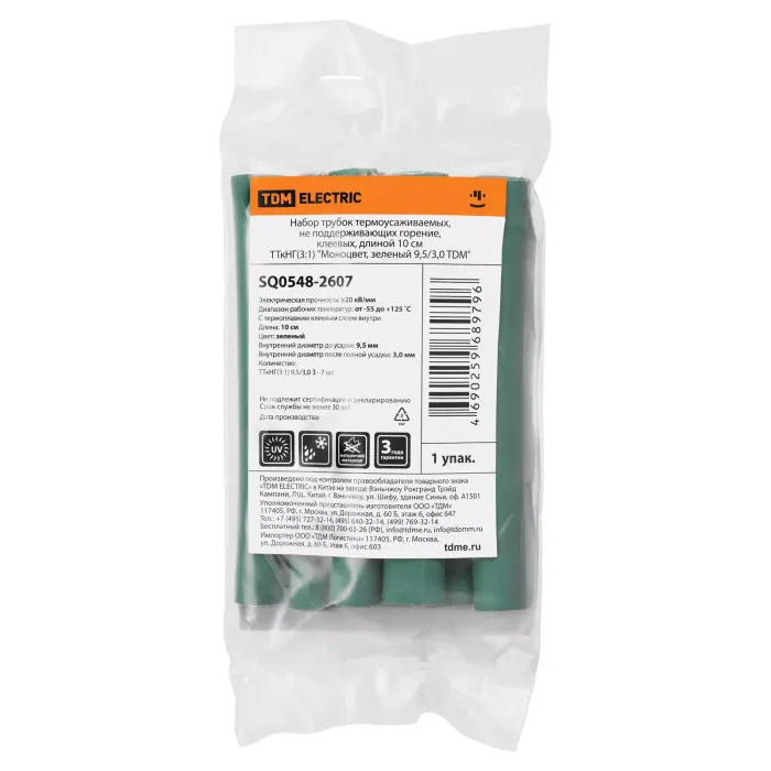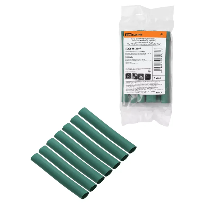 Преимущества: Коэффициент усадки 3:1 или 4:1. Зависит от набора Устойчивость к ультрафиолетовому излучению и погодным условиям Прочность на растяжение и разрыв Материал не поддерживает горение С термоплавким клеевым слоем на внутренней поверхности