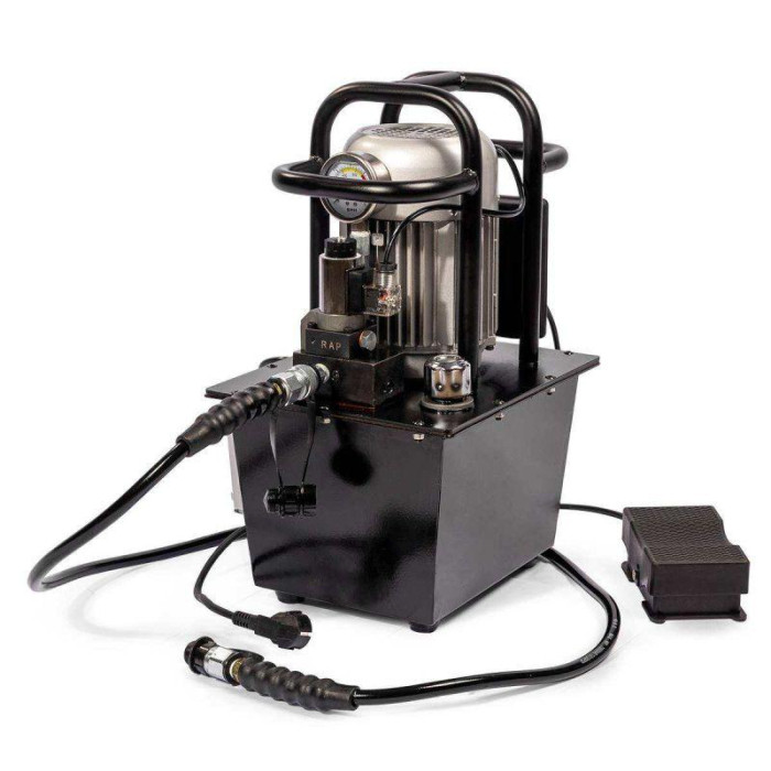 • В комплекте:• электрогидравлическая помпа• рукав высокого давления длиной 1.8 м• дистанционный ножной пульт управления• Электромагнитный трехпозиционный гидрораспределитель работает в режиме «рабочий ход – удержание – возврат» с возможностью удержания рабочего механизма под нагрузкой (домкраты, трубогибы и т. д.)• Производительность насоса:• 1 ступень – 2.8 л/мин• 2 ступень – 0.5 л/мин• Объем маслобака: 10 л• Максимальное давление: 700 бар (70 МПа)• Механизм автоматического сброса давления (АСД)• Присоединительная резьба на конце РВД: K 3/8" «вилка» по ГОСТ 6111-52• Виброустойчивый манометр• В стенку маслобака встроен термометр и индикатор уровня масла• Мощность электродвигателя: 0.75 кВт• Напряжение: 230 В/50 Гц• Вес инструмента: 37.2 кг• Габариты упаковки: 475х335х570 мм