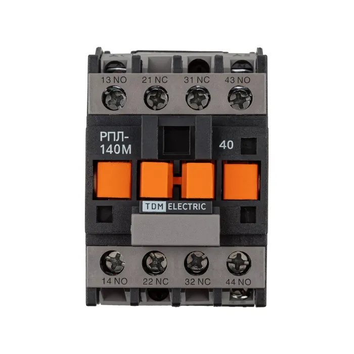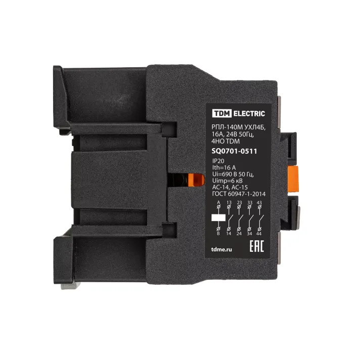 Назначение: Элементы схем управления и сигнализации промышленного оборудования напряжением до 440 В DC и до 690 В АСПрименение: Применяются в качестве комплектующих изделий в стационарных электроустановках в схемах управления. РПЛ-140М УХЛ4Б, 16А, 24В 50Гц, 4НО TDM