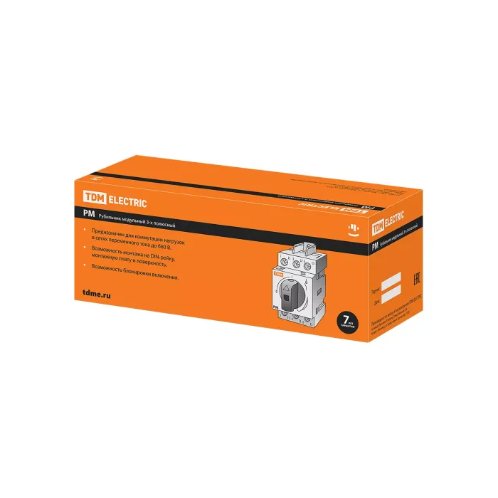 Назначение: Частое оперативное включение и выключение электрической цепи.Проведение тока в нормальном режиме.Применение: Вводно-распределительные устройства для жилых и общественных зданий.Пункты управления отдельными нагрузками: двигателями, насосами, станками и т. д.Преимущества: Повышенная коммутационная способность АС-23 А позволяет использовать рубильник для нагрузок смешанного типа и электродвигателей.Двойной разрыв каждой фазы.Механизм быстрого включения и отключения.Номинальное выдерживаемое импульсное напряжение 8 кВ.Материалы: Контактная группа рубильника выполнена из электротехнической меди с гальваническим покрытием, что предотвращает ее окисление в процессе эксплуатации.Корпус рубильника выполнен из негорючего полиамида, армированного стекловолокном (PA6.6).Упаковка: РМ-16 по 6 шт.РМ-20 по 6 шт.РМ-25 по 6 шт.РМ-40 по 6 шт.РМ-63 по 6 шт.РМ-80 по 4 шт.РМ-100 по 4 шт.РМ-125 по 4 шт. Рубильник модульный РМ-40 3П 40A TDM