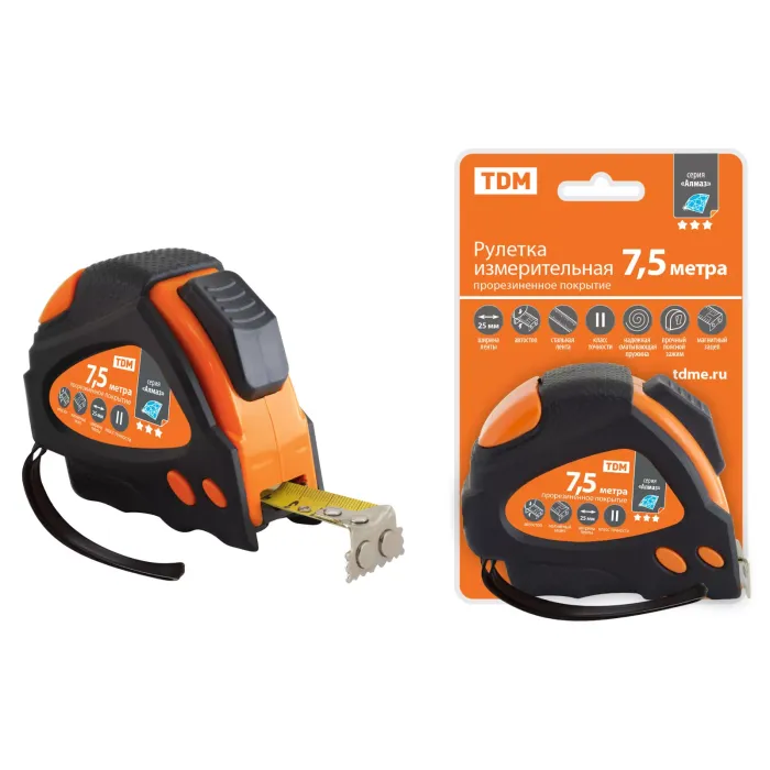 Преимущества: Надежная сматывающая пружина и удобный корпус. Магниты для зацепления за металлические предметы и дополнительные зубцы в крючке (в серии «Рубин»). Прорезь в крючке для черчения окружностей (в серии «Гранит»). Удобный подвес для размещения в торговом зале, который содержит всю необходимую информацию о преимуществах продукта и типе, а также штрих-код Дополнительное усиление заклепок крючка. Функция автостоп – автоматическая фиксация выдвинутого измерительного полотна (в серии "Алмаз") Утолщенное пластиковое покрытие ленты, защищающее разметку. Удобство и долговечность-прорезиненная вставка способствует хорошему захвату инструмента и надежно защищает корпус рулетки от повреждений при падении
