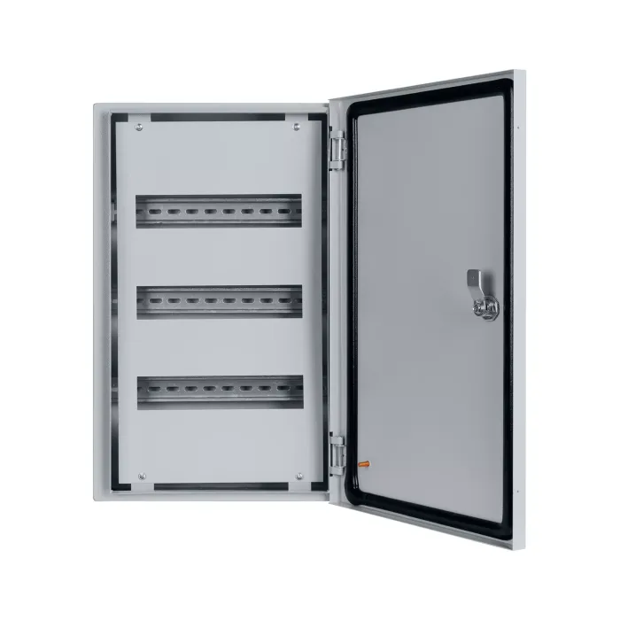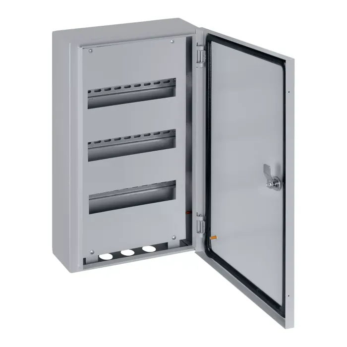 Конструкция: Травмобезопасная технология: крепление стенки при помощи заклепок. Декоративная рамка с дополнительным отгибом для щитов, встраиваемых в нишу. Элемент заземления на дверце. Перенавешиваемая дверца (для IP31). Усиленные петли (для IP66).
