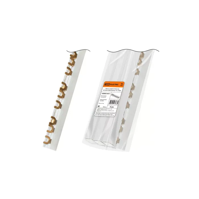 Назначение: Шины соединительные используются для удобного и безопасного соединения групп:- автоматических выключателей;– автоматических выключателей, управляемых дифференциальным током (АВДТ);– выключателей, управляемых дифференциальным током (УЗО) и других модульных устройств.Применение: В шкафах, щитах, сборках.Преимущества: Возможность коммутации группы автоматических выключателей без использования проводаКонструкция: Однополюсная гребенка состоит из одной сплошной медной пластины прямоугольного сечения (шинки) на которой выполнены ответвления через определенное расстояние для параллельного подключения модульных автоматов, УЗО, дифавтоматов, контакторов . Пластина помещается в специальный пластиковый корпус из негорючего материала. Двух и трехполюсные шины имеют соответственно две и три сплошные пластины отделенные друг от друга изоляционной перегородкой.Материалы: Изолирующий профиль изготовлен из самозатухающего пластикаКомплектация: Паспорт Шина соединительная 3П 63A FORK (вилка) 1м. TDM