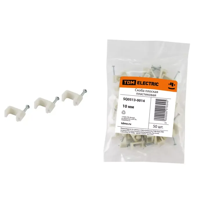 Материалы: Скоба - гибкий негорючий ударопрочный полипропилен. Гвоздь - закаленная оцинкованная сталь.