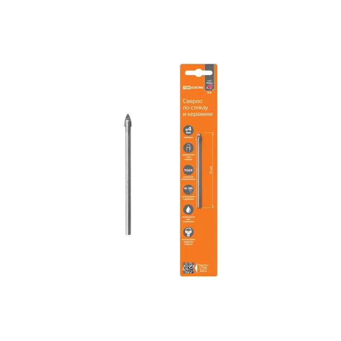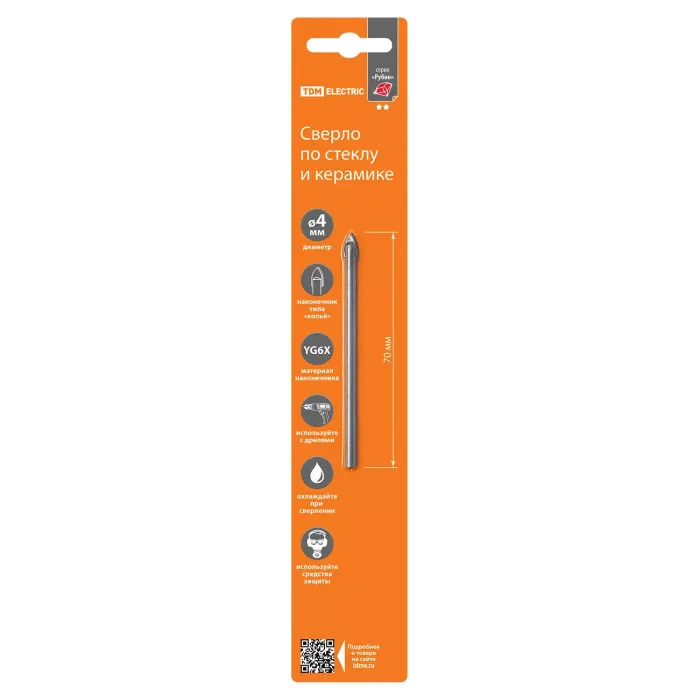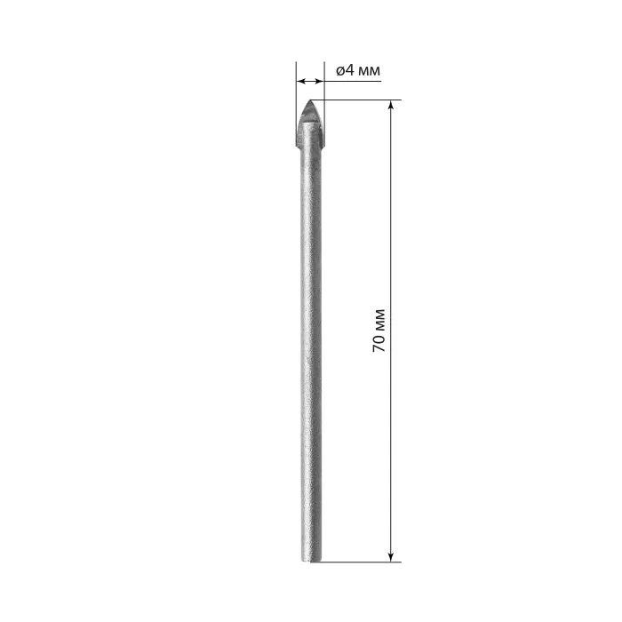 Сверло по стеклу и керамике 4×70 мм, 2 реж., лезвия, цилиндр. хв., блистер 1 шт, "Рубин" TDM