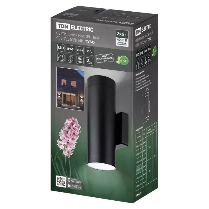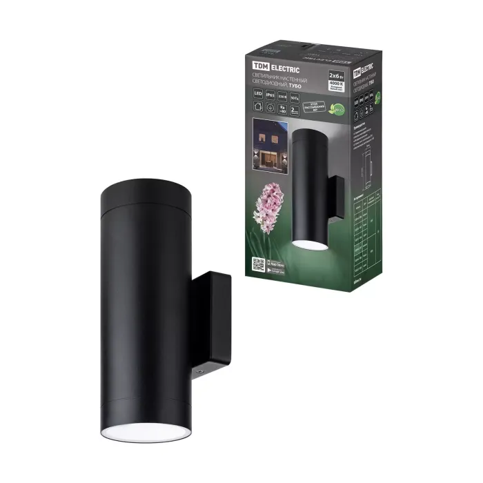 Применение: Для создания светового рисунка на фасаде.Дизайнерское оформление современных ресторанов, кафе, шоурумов, общественных зданий.Для общей и декоративной подсветки фасадов зданий, загородных домовладений.Преимущества: Широкая ассортиментная линейка.Высокий индекс цветопередачи (≥80).Степень пыле- и влагозащиты IP65.Высокая энергоэффективность.Мгновенное включение.Современный стильный дизайн.Материалы: Материал рассеивателя - поликарбонат, стекло.Корпус светильника изготовлен из устойчивого к коррозии алюминиевого сплава и покрыт термостойкой краской.Комплектация: Индивидуальная упаковка.Крепежный набор (саморез - 4 шт., дюбель - 4 шт., шестигранник - 1 шт.).Руководство по эксплуатации. Паспорт.Светильник. Светильник настенный LED, Тубо, 2х6 Вт, 4000 К, H252 мм, алюм./черн., вверх/вниз, IP65, TDM