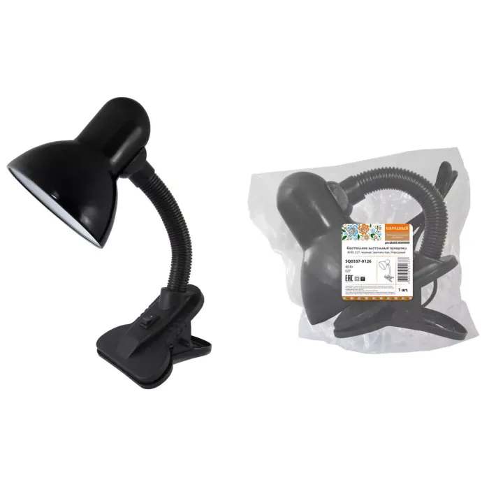 Светильник настольный прищепка 40Вт, E27, черный, (мягкая упак.) Народный
