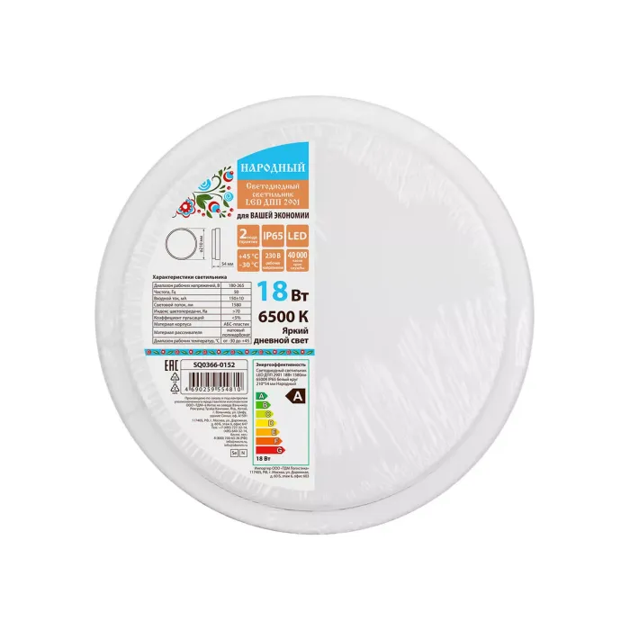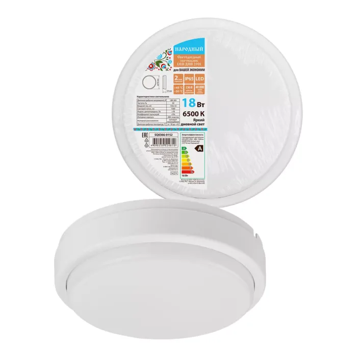 Светодиодный светильник LED ДПП 2901 18Вт 1580лм 6500К IP65 белый круг 210*54 мм Народный