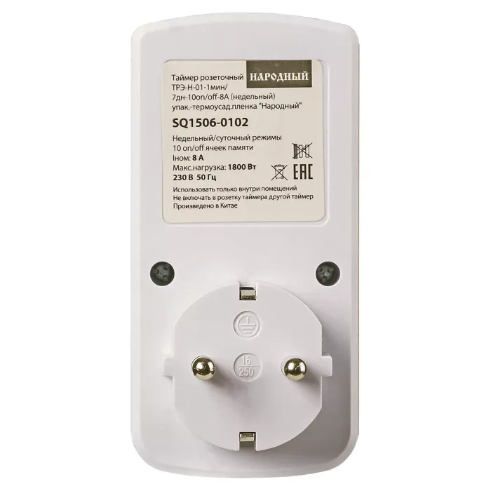 Назначение: Для использования в быту, офисе, загородном доме.Применение: Для автоматизации управления бытовыми электроприборами, освещением и др.Преимущества: • Таймер ТРЭ-Н имеет встроенный аккумулятор, который сохраняет всю информацию в течение 360 часов• Таймер ТРЭ-Н может программироваться для работы в определенные дни недели, все программы повторяются каждую следующую неделю• Таймер ТРМ-Н легко и быстро программируется в течение 1 минутыКонструкция: • ТРМ-Н – таймер розеточный механический серии «Народный» работает по суточному циклу• ТРЭ-Н – таймер розеточный электронный серии «Народный» работает по суточному и/или недельному циклам