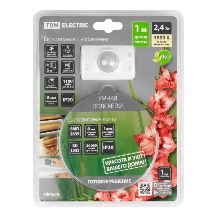 Назначение: Декоративное и контурное освещение.Применение: Для подсветки мебели (шкафы, кровати), рабочих зон (кухня, кабинет), коридоров и подсобных помещений.Простое решение монтажа светодиодной подсветки в квартире и на даче.Преимущества: Монтаж комплекта светодиодной ленты настолько прост, что его можно выполнить самостоятельно, не имея специальных навыков.Наличие в ассортименте светодиодных лент с цветовой температурой 3000 К и 6500 К (теплый белый и яркий дневной свет).Источник автономного питания не требует подключения к стационарной сети. В комплекте: светодиодная лента, блок питания, датчик движенияУпаковка: БлистерТранспортная упаковка – картонная коробка.