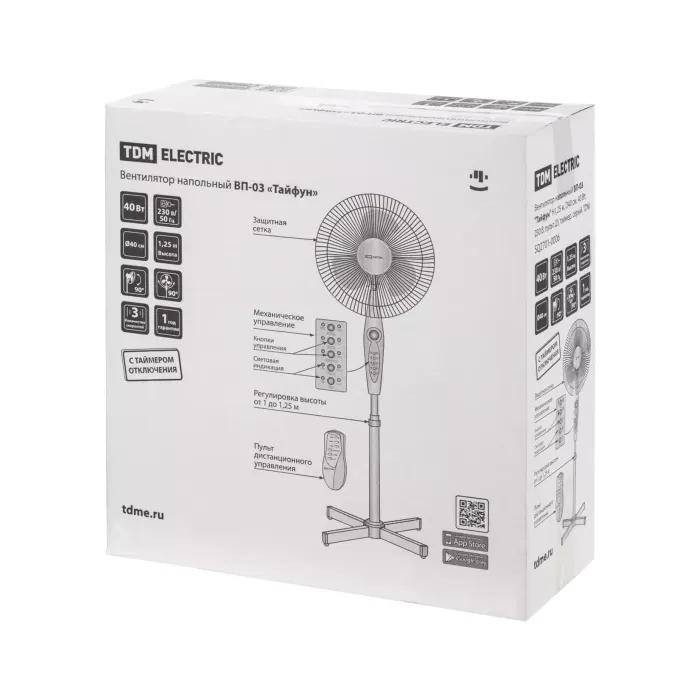 Вентилятор напольный ВП-03 "Тайфун" H1,25 м, D40 см, 40 Вт, 230 В, пульт ДУ, таймер, серый, TDM