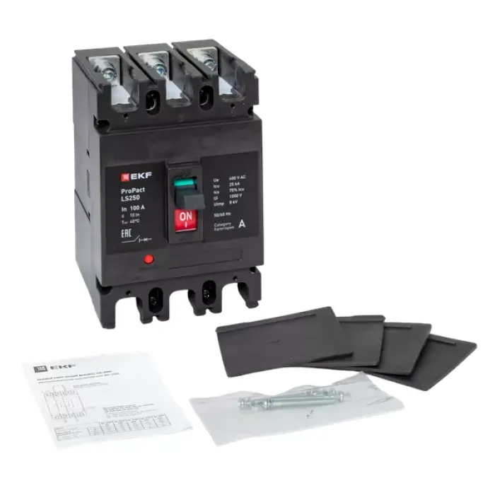 Выключатель LS ProPact выполнен в виде моноблока и состоит из основания и крышки с фальшпанелью, в которой имеется окно для рукоятки управления и толкатель кнопки «Тест» - проверки механизма отключения выключателя. Основание выполнено из термостойкой пластмассы, не поддерживающей горение и являющейся несущей конструкцией для присоединительных зажимов, неподвижных и подвижных контактов с системой дугогашения, механизма управления, блока защиты от сверхтоков. Крышка закрывает все подвижные элементы механизма управления и внутренние токоведущие части. Данная серия не подразумевает возможность установки аксессуаров