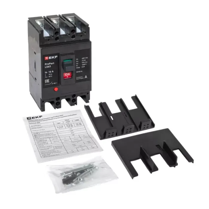 Выключатель LS ProPact выполнен в виде моноблока и состоит из основания и крышки с фальшпанелью, в которой имеется окно для рукоятки управления и толкатель кнопки «Тест» - проверки механизма отключения выключателя. Основание выполнено из термостойкой пластмассы, не поддерживающей горение и являющейся несущей конструкцией для присоединительных зажимов, неподвижных и подвижных контактов с системой дугогашения, механизма управления, блока защиты от сверхтоков. Крышка закрывает все подвижные элементы механизма управления и внутренние токоведущие части. Данная серия не подразумевает возможность установки аксессуаров