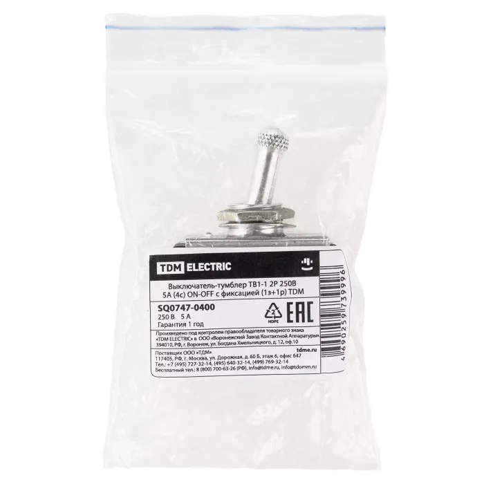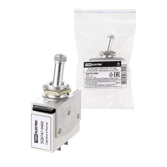 Выключатель-тумблер ТВ1-1 2P 250 В 5 А (4c) ON-OFF с фиксацией (1з+1р) TDM
