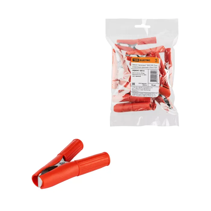 Зажим "крокодил" ЗКИ 30А 75мм в изоляции красный (10шт) TDM